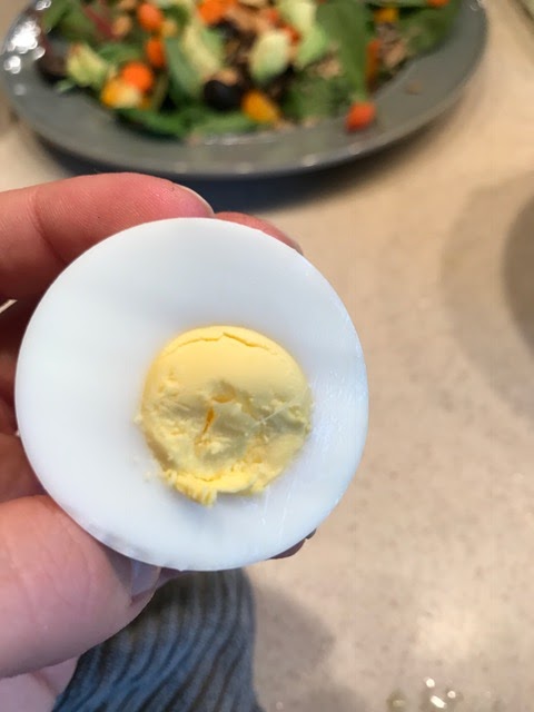 Kelly's never steered me wrong with anything since the day I met her. And her track record continues because this. is. phenomenal. I simply placed my eggs on the rack of the IP with a bit of water underneath, then closed the lid and set the timer for 3 minutes on Manual. The IP did it's thing, and once the cooking was complete, I quick released the pressure. When I opened the lid, they pretty much looked exactly the same as when I put them in. I *carefully* took them out and popped them into some ice water in the fridge. I let them sit for about 10-15 minutes while I prepped the rest of our soon-to-be salads.